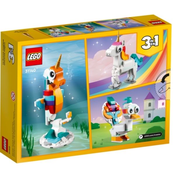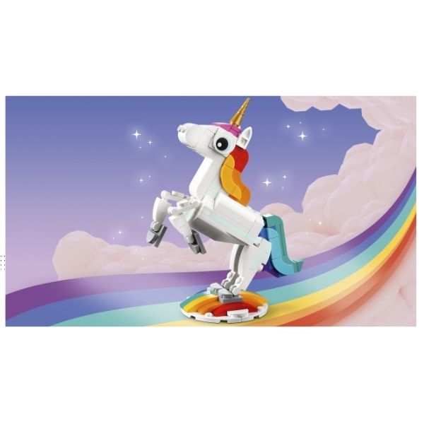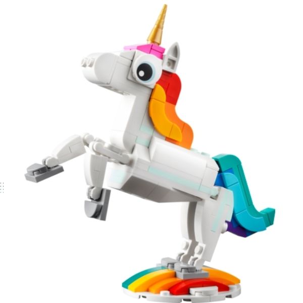 It features a unicorn toy with a golden horn, colorful tail, and posable legs and hooves. It can be presented in 2 different positions: standing on 4 legs or reared up on its 2 hind legs for an iconic pose and displayed on the set's rainbow stand. Build colorful animals from LEGO bricks The mythical action never stops with 3 different magical creatures for little builders to assemble in this LEGO Creator 3in1 set. They can build a posable Magical Unicorn, rebuild it into a posable seahorse toy with a seabed stand, turn it into a posable magical peacock with a colorful tail, or even use the bricks to create another enchanting creature. LEGO Builder app Download the LEGO Builder app and step into a new world of building fun where kids can zoom in and rotate models in 3D, save sets and track their progress.